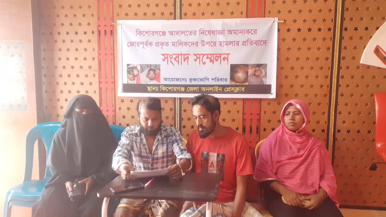 সংবাদ সম্মেলনে তিনি আবেগঘন কণ্ঠে বলেন “আমার পিতার বৈধ সম্পত্তি দখলের জন্য প্রতিপক্ষ নানাভাবে ষড়যন্ত্র করছে। মিথ্যা মামলা দিয়ে হয়রানি করছে, আবার আদালতের নিষেধাজ্ঞা অমান্য করে জোরপূর্বক দখলের চেষ্টা করছে। এমনকি প্রকাশ্যে আমাকে প্রাণনাশের জন্য আমাকে ও আমার বাতিজাকে রামদা দিয়ে কোপ দিয়ে আহত করেছ বর্তমানে কিশোরগঞ্জ সদর হাসপাতালে চিকিৎসা দিন আছি।”