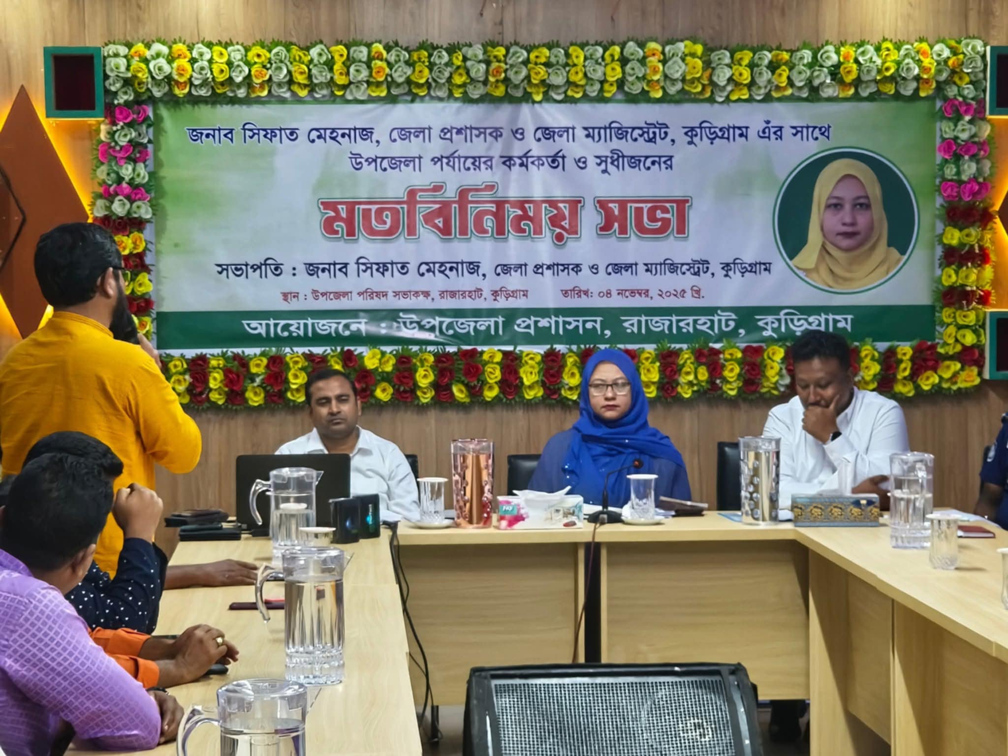 কুড়িগ্রামের জেলা প্রশাসক ও জেলা ম্যাজিস্ট্রেট সিফাত মেহনাজ এর সাথে রাজারহাট উপজেলা পর্যায়ের কর্মকর্তা ও সুধীজনের মতবিনিময় সভা অনুষ্ঠিত হয়েছে। মঙ্গলবার দুপুরে রাজারহাট উপজেলা প্রশাসনের আয়োজনে উপজেলা সম্মেলন কক্ষে এই মত বিনিময় সভা অনুষ্ঠিত হয়। এ সময় কুড়িগ্রাম জেলা প্রশাসক সিফাত মেহনাজ এর সভাপতিত্বে বক্তব্য দেন, উপজেলা নির্বাহী কর্মকর্তা মো: আল-ইমরান রাজারহাট থানার ভারপ্রাপ্ত অফিসার ইনচার্জ আব্দুল রহিম, রাজারহাট উপজেলা স্বাস্থ্য ও পঃপ কর্মকর্তা ডা: গোলাম রসুল রাখি, উপজেলা বিএনপির ভারপ্রাপ্ত আহবায়ক এডভোকেট শফিকুল ইসলাম, উপজেলা জামায়াতের আমির মাও: কফিল উদ্দিন রাজারহাট প্রেসক্লাবের সেক্রেটারি আসাদুজ্জামান আসাদ, উপজেলা যুবদল আহবায়ক আব্দুল কুদ্দুস, উপজেলা প্রাথমিক শিক্ষা কর্মকর্তা শরিফ আহমেদ, উপজেলা স্বেচ্ছাসেবক দল আহবায়ক আনিছুর রহমান লিটন, উপজেলা মহিলা বিষয়ক কর্মকর্তা জয়ন্তি রানী, এনসিপি নেতা রাশেদুল ইসলাম সহ অনেকে।