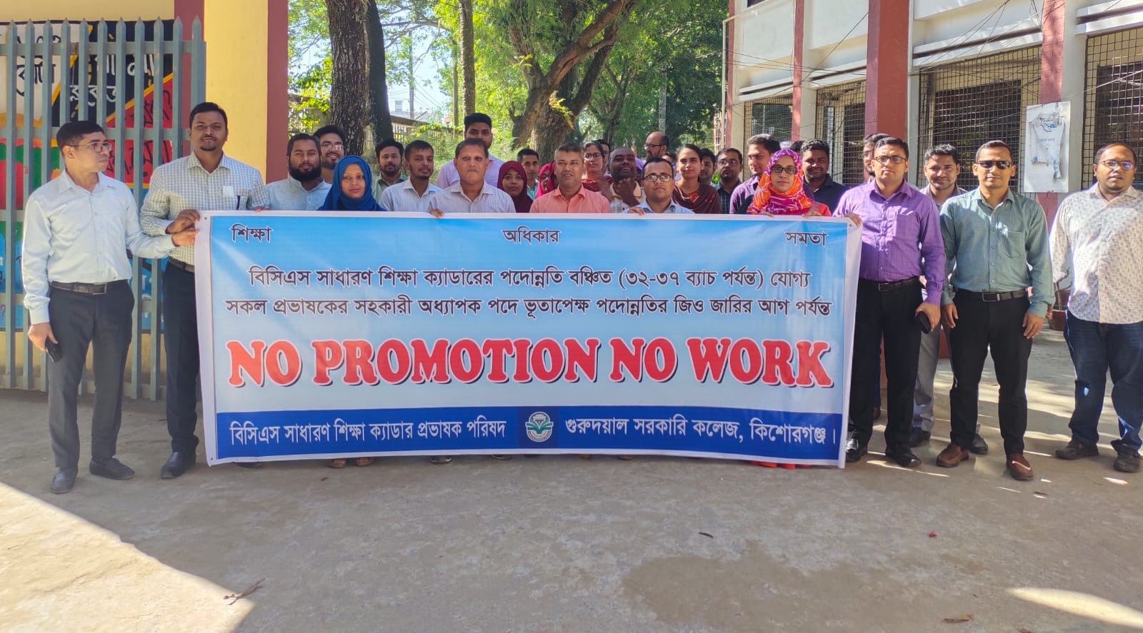 সোমবার (১৭ নভেম্বর) বিসিএস সাধারণ শিক্ষা ক্যাডারের যোগ্য প্রভাষকদের সহকারী অধ্যাপক পদে পদোন্নতিসহ তিন দফা দাবিতে কিশোরগঞ্জে কর্মবিরতি ও মানববন্ধন করেছেন শিক্ষা ক্যাডারের সদস্যরা। গুরুদয়াল সরকারি কলেজ ইউনিটের উদ্যোগে এই কর্মসূচি পালন করা হয়।
