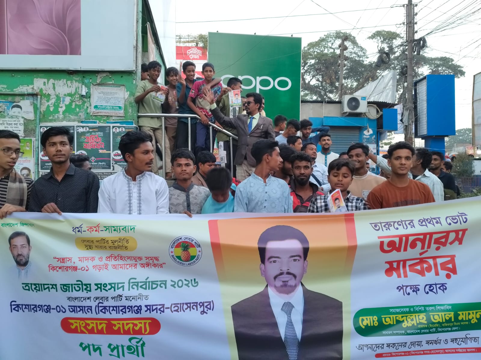অদ্য ২৮/১১/২৫ ইং কিশোরগঞ্জ জেলা বাংলাদেশ লেবার পার্টি কর্তৃক আয়োজিত পদযাত্রা ও আলোচনা সভা অনুষ্ঠিত হয়। উক্ত পদযাত্রাটি কিশোরগঞ্জ শহরের প্রাচীন প্রতিষ্ঠান আজিমউদ্দিন উচ্চ বিদ্যালয়ের মাঠ প্রাঙ্গণ থেকে শুরু হয়ে,পুরানথানা,গৌরাঙ্গ বাজার মোড়,ঈশাখাঁ রোড়,কালীবাড়ি মোড়, আখড়াবাজার মোড়, ঐতিহাসিক রথখলায় হয়ে পুরানথানায় ইসলামিয়া সুপার মার্কেটে এসে সংক্ষিপ্ত এক আলোচনার মধ্যে দিয়ে শেষ হয়। লেবার পার্টির এই পদযাত্রা পরবর্তী আলোচনা সভায়,এবং আনারস প্রতীকের এই আলোচনা সভায় বক্তব্য রাখেন,মো: মহিবুল আল মাহাদী কিশোরগঞ্জ জেলা বাংলাদেশ লেবার পার্টির সভাপতি,মো: আতাউল রহমান সোহাগ, সাবেক সভাপতি বাংলাদেশ লেবার পার্টি কিশোরগঞ্জ জেলা শাখা,মোঃ সাজন খান,সাংগঠনিক সম্পাদক,বাংলাদেশ লেবার পার্টি কিশোরগঞ্জ জেলা শাখা, মো: সানি,বাংলাদেশ ছাত্র মিশন কিশোরগঞ্জ জেলা শাখা, মো: ওয়াসিম সাধারণ সম্পাদক বাংলাদেশ লেবার পার্টি কিশোরগঞ্জ জেলা শাখা, সমাপনী বক্তব্য রাখেন বাংলাদেশ লেবার পার্টি মনোনীত কিশোরগঞ্জ- হোসেনপুর-১ আসনের আনারস প্রতীকের মো: আবদুল্লাহ আল মামুন। উক্ত সমাবেশে বক্তব্যে আগামী ত্রয়োদশ জাতীয় সংসদ নির্বাচনে লেবার পার্টির প্রার্থীর জন্য আনারস প্রতীকে ভোট চেয়ে সমাবেশের সমাপ্তি ঘোষণা করেন এবং প্রার্থী নিজ বক্তব্যে বলেন,লেবার পার্টি যদি বিজয়ী হয় আর আমি মামুন যদি সংসদ সদস্য নির্বাচিত হতে পারি তাহলে কিশোরগঞ্জ-হোসেনপুর হবে সন্ত্রাস মুক্ত, দুর্নীতিমুক্ত,এবং শিক্ষার গুনগত মান হবে ডিজিটাল পদ্ধতিতে। এই সময় উৎসুক জনতা আনারস প্রতীকের স্লোগানে মুখরিত করে লেবার পার্টির মনোনীত প্রার্থী আবদুল্লাহ আল মামুন কে।