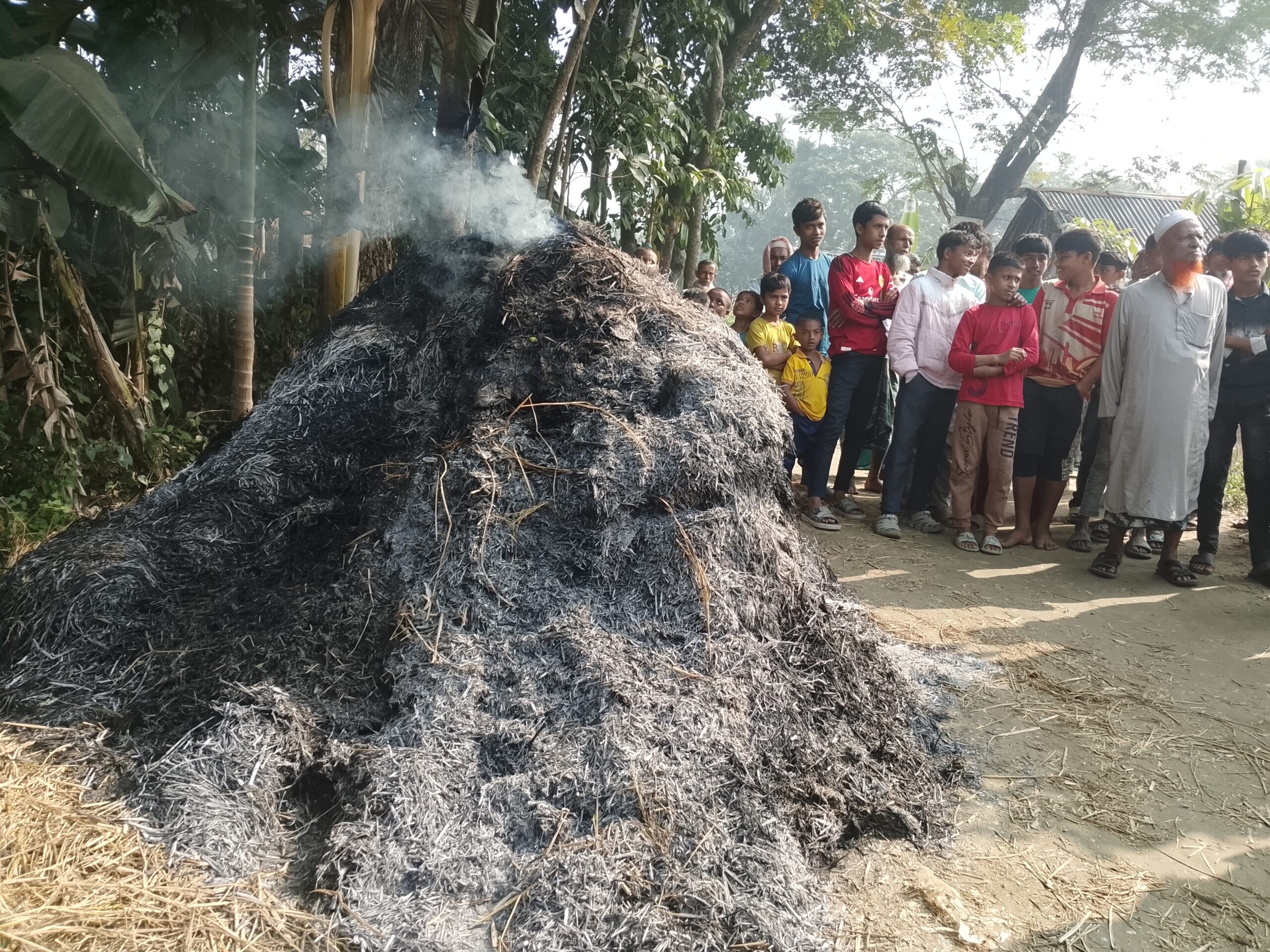 স্থানীয় সুত্রে জানা যায়, মঙ্গলবার রাত ৩ টার দিকে বীর মুক্তিযোদ্ধা মো. হাবিবুর রহমান মাস্টারের ফিসারির পাড়ে খড়ের গাদায় আগুন ধরিয়ে দেয় দুর্বৃত্তরা। এসময় আগুনের লেলিহান ছড়িয়ে পড়ে গাদাজুড়ে এতে খড়ের গাদা পুড়ে ছাই হয়ে যায়। পরে ভোর ৫ টার দিকে বীর মুক্তিযোদ্ধা মোঃ হাবিবুর রহমান মাস্টার ঘুম থেকে উঠে দেখে তার খড়ের গাদা পুড়ে ছাই হয়ে গেছে। পরে খড়ের গাদায় আগুন দেওয়ার খবর পেয়ে সকালে পুলিশ ঘটনাস্থল পরিদর্শন করে ঘটনার সঙ্গে জড়িতদের বিরুদ্ধে ব্যবস্থা নেওয়ার আশ্বাস দেয়। রাতের আঁধারে খড়ের গাদায় আগুনের ঘটনায় স্থানীয়দের মাঝে আতঙ্ক বিরাজ করছে।