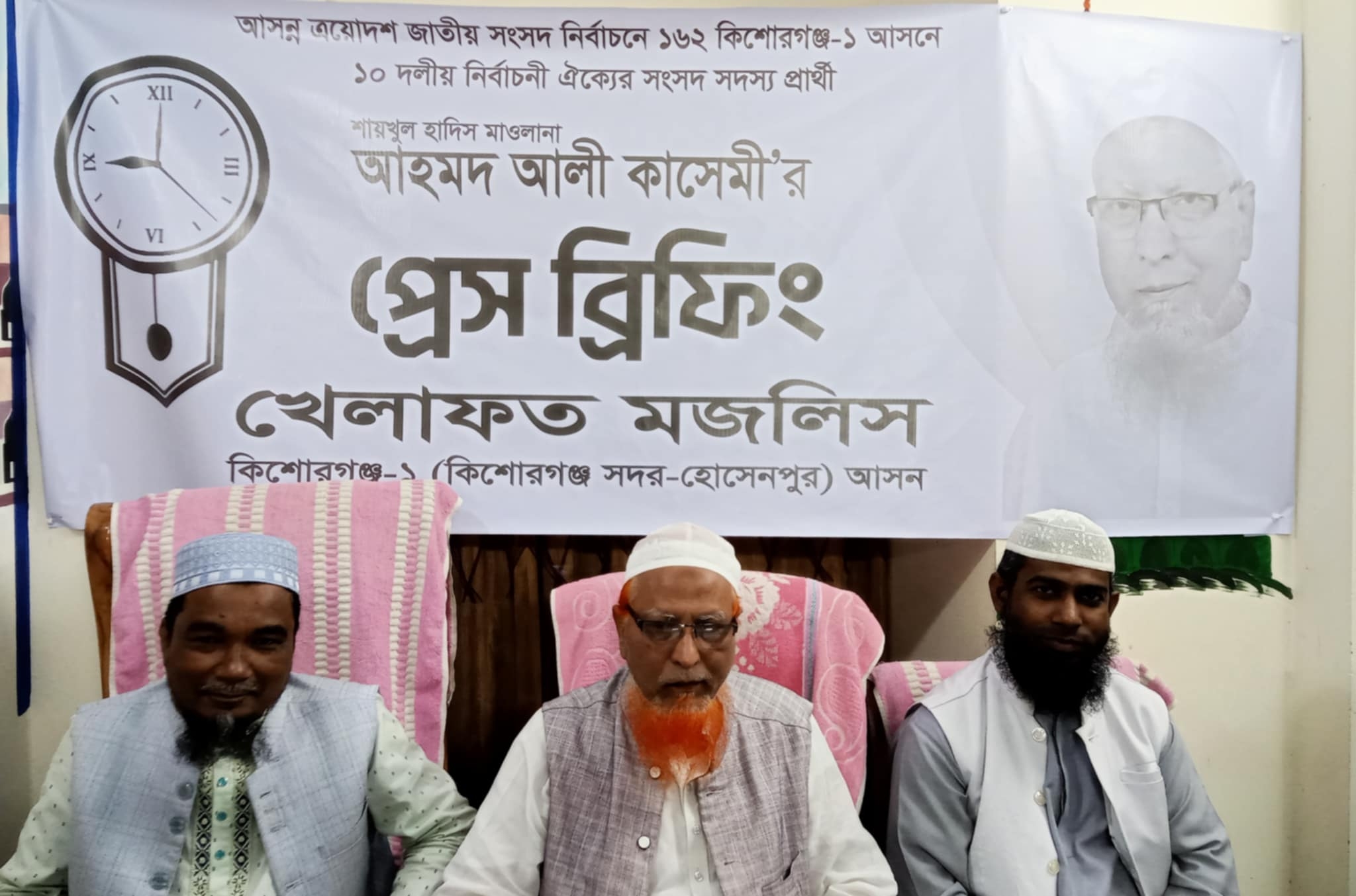 কিশোরগঞ্জ-১ আসনে খেলাফত মজলিস মনোনীত ১১ দলীয় নির্বাচনী ঐক্যের দেওয়াল ঘড়ি প্রতীকে সংসদ সদস্য পদ প্রার্থী শায়খুল হাদিস মাওলানা আহমদ আলী কাসেমী নির্বাচন থেকে সরো যাননি বরং সক্রিয় আছেন বলে কিশোরগঞ্জের সাংবাদিকদের নিয়ে সংবাদ সম্মেলন করে তিনি জানিয়েছেন।