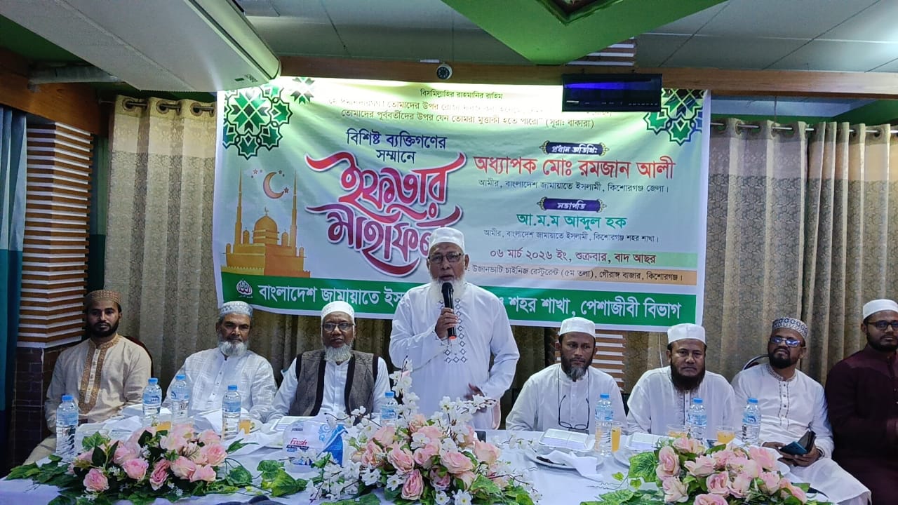 আতাউল হাসান দিনার :-বাংলাদেশ জামায়াতে ইসলামী কিশোরগঞ্জ শহর শাখার পেশাজীবি বিভাগের উদ্যাগে কিশোরগঞ্জ শহরের উজানভাটি চাইনিজ পার্টির হলরুমে ইফতার মাহফিল অনুষ্ঠিত হয়।