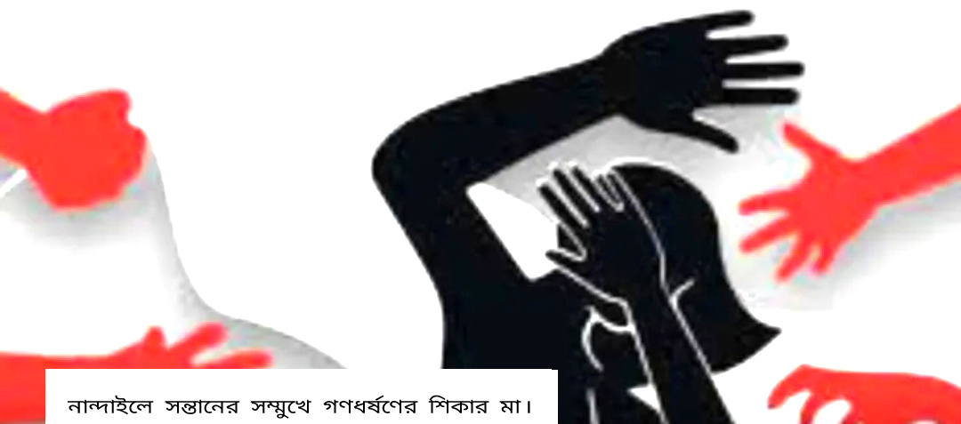 শনিবার সরজমিন উপজেলার রাজগাতী ইউনিয়নের গাতীপাড়া গ্রামের ইন্দু মিয়ার বাড়িতে থাকা নির্যাতিতা নারী ও তাকে আশ্রয়দাতা পরিবারের লোকজনরা জানান, গত সোমবার নিজ বাড়ি থেকে রওনা হয়ে শ্বশুর বাড়ি ভালুকা যাওয়ার পথে রাস্তা হারিয়ে নান্দাইল চৌরাস্তা এলাকার চলে আসলে সন্ধ্যায় কয়েকজন লোক উক্ত নারীকে শ্বশুর বাড়ি পৌছে দেওয়ার কথা বলে নান্দাইল চৌরাস্তা থেকে তাড়াইল সড়ক পথে শিমুলতলা এলাকার একটি বিলে নিয়ে চারজন মিলে পালাক্রমে ধর্ষন করে। পরে অপেক্ষমান আরও দুইজন উক্ত এলাকার একটি বাড়িতে নিয়ে আবারও ধর্ষন করে ধর্ষিতাকে ফেলে রেখে যায়। শিমুলতলা এলাকার ইজিবাইক চালক সুজন মিয়া জানান, ঘটনার দিন রাতে শিমুলতলা এলাকায় উক্ত নারীর কুলে থাকা শিশু সন্তান নিয়ে রাস্তায় কাদতে থাকা অবস্থায় দেখতে পেয়ে তাকে জিজ্ঞাসা করলে উক্ত নারী জানায় ৪জন ব্যক্তি তাকে বিলে নিয়ে পালাক্রমে ধর্ষন করে। পরে আরও দুইজন একটি বাড়িতে নিয়ে জোরপূর্বক আবারও ধর্ষন করে। বিলে নিয়ে ধর্ষনের সময় নারী কুলে থাকা শিশু সন্তান কান্না করলে ধর্ষনকারীরা শিশুটিকে কিল-ঘুষি মেরে আহত করে। এতে করে শিশুটির চোখের নিচে ফুলে যায়।